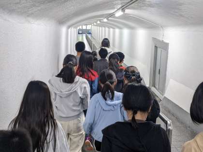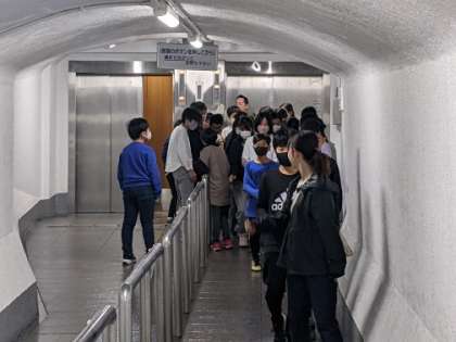 エレベーターを降りたら、寒く感じます。クラスごとに並んで、濡れた床に気を付けながら歩いていきます。