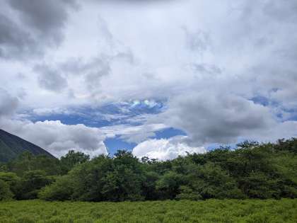 今朝まで降っていた雨も上がり、日差しが差し込む中で、雲と虹が合体したような景色です。