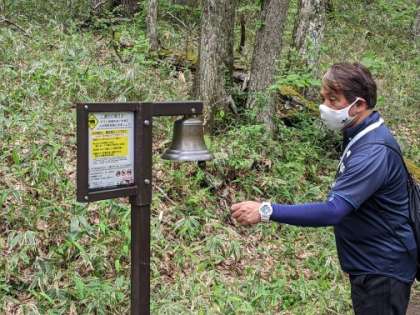 1つは大きな鈴です。熊避けのために、大きくべルを鳴らすように書いてあります。自分のため、そして、近辺を歩いている人たちのためで、鳴らした鈴の大きな音を聞いた熊が人間が近くにいることを知り、それ以上近付かない、あるいは逃げていくということです。