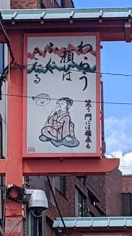 おそらく夜になると明かりが灯る街灯だと思いますが、ユーモラスな絵と言葉が書かれています。