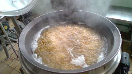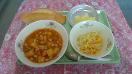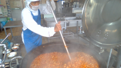 チキンビーンズには大豆をたくさん使っています。大豆には良質のたんぱく質が豊富に含まれているので、給食ではよく登場します。写真2枚目のように、給食では、乾燥した固い大豆を朝から大きなお釜で煮て、柔らかくしています。(茹で大豆のような加工品は使っていません。)そして、よく煮込んだ、ケチャップベースのスープに入れ、ブラウンルウでとじればできあがりです。