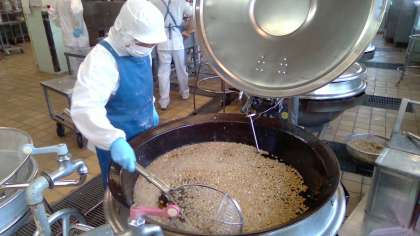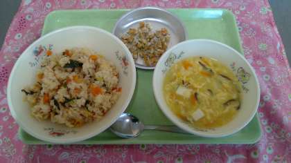 ポップビーンズは、大豆を給食室でボイルし、柔らかくした後、片栗粉を薄くつけて、油でカラッと揚げました。塩と青のりをまぶし、香ばしく仕上げました。給食では大人気メニューのひとつで、楽しみにしていた人も多かったと思います!教室でも大好評!大豆の良質なたんぱく質を体にしっかり取り入れることができました。
