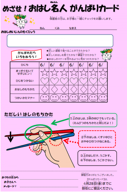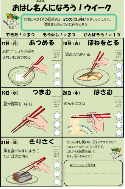 今日は、給食の時間に勉強する、5つのはし使いのうち、「魚をきりさく」に挑戦しました。中学年や高学年の皆さんには、おはし名人の取組がしっかり浸透していて、教室で「きりさく」をいっしょに行ってみてもとても上手でした!!写真2枚目のグリーンのカードはこの5日間の成果を☆で表しています。色を塗って、担任の先生に提出します。写真3枚目のピンクのカードは、1・2年生の皆さんが、ご家庭で取り組みます。お手紙でお知らせいたしましたが、ご家庭でのおはしの使い方のご指導をいただきますよう、よろしくお願いいたします。ピンクのカードは記入が終わりましたら、担任の先生までご提出ください。さて、来週は「ザ・チャレンジ!おはし名人になっちゃおう!」に取り組みます。30秒で、どれだけ豆を運べるか、がんばります。保健給食委員会の児童のみなさんもポスターを掲示したり、準備をしています。たくさんの児童の皆さんに参加してほしいと思っています!!