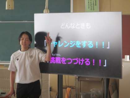 本当は体育館に全校児童が集まって直接お話を伺う予定でした。