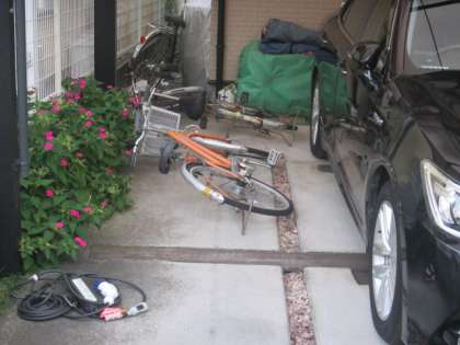 駐車場の自転車は風で倒れて車を傷つけないよう予め倒してあります(写真)。