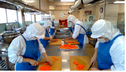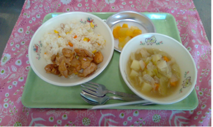 今日は野菜をたくさん使った献立でした。コーンピラフにはコーン、たまねぎ、にんじん、スープ煮にはたまねぎ、にんじん、キャベツ(1人50g!!)を使いました。切り方もその料理に合うように、大きさ、厚さなど細かく決めて切っています。今日はピラフの野菜は色紙切り、スープ煮は小さい角切り(給食室ではコロコロと呼んでいます)にしました。総勢6名の野菜の切る音が給食室に響き、調理の始まりです。