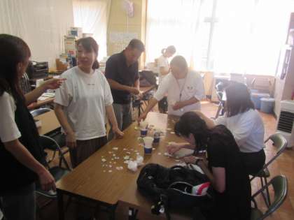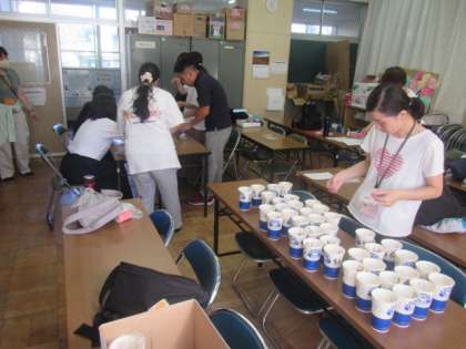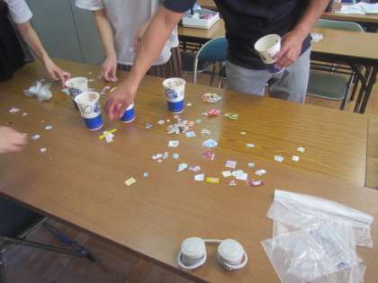 写真:皆様からお預かりしたベルマークを切りそろえたり、分類して紙コップ(ビールのカップ!?)に入れたり、細かい仕事で大変です。