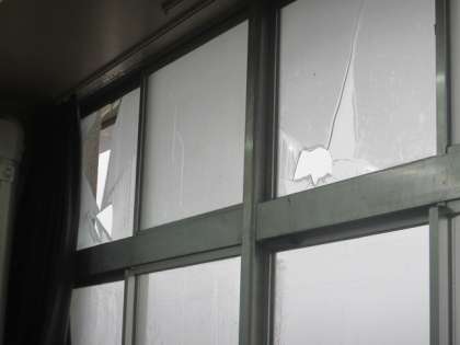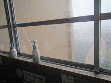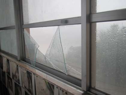 校内でも窓ガラスが割れており、安全を確認するまで時間を要します。(写真)