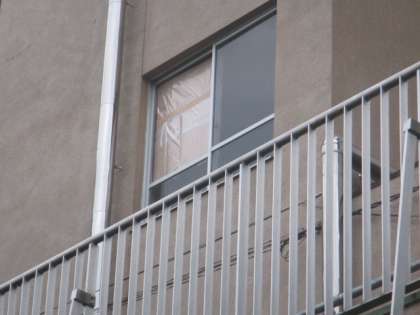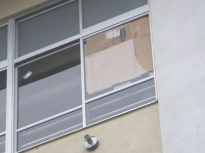 割れたガラスを取り除き、段ボールで塞いでいます。(写真)