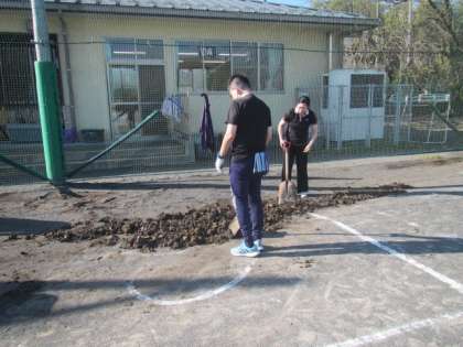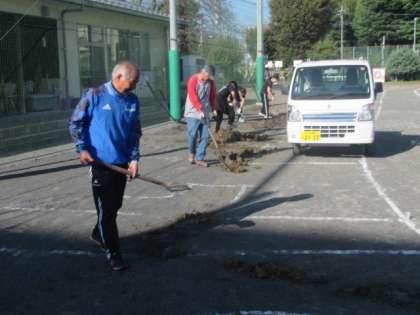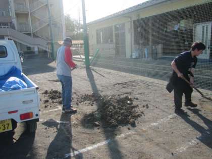 川のように校庭に水が流れ地面がえぐられてしまったところに土を入れる作業を行いました。