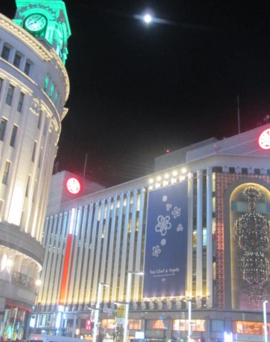 下:銀座の夜空に輝くコールドムーン