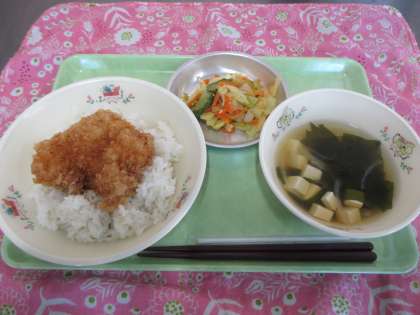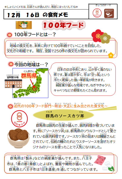 今日は月に1度の、全国の100年フードを紹介し、食べる日です。群馬県は豚肉の生産が盛んです。令和3年度には、「近代の100年フード」に「群馬のソースカツ丼」が認定されました。給食で再現してみました!!豚肉だけではなく、ソースにもこだわりがあるそうです。昔はうなぎのかば焼きのたれにウスターソースを混ぜていたそうです。とてもおいしそうですね!!給食ではさすがに、伝統のうなぎのたれは作れないので、ウスターソースをベースに、みりんやしょうゆを入れて仕上げています。たっぷりカツにかけていただきました。教室でも大人気でした!!