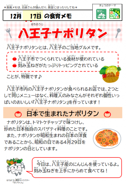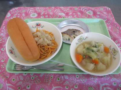 八王子ナポリタンは知る人ぞ知る、八王子のご当地グルメです。八王子ナポリタンを名乗るには、条件があり、八王子産の野菜を1種類以上使用すること、刻みたまねぎをトッピングすることです。給食では生のたまねぎは使用できないので、オリーブオイルで炒めてクラスごとに配缶したナポリタンスパゲッティに散らしました。