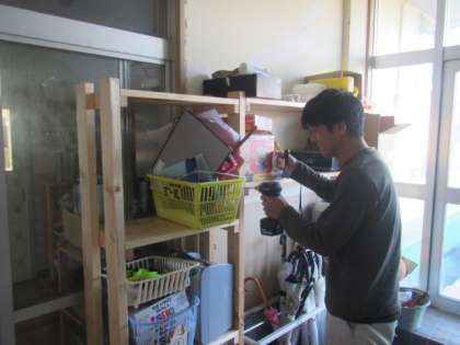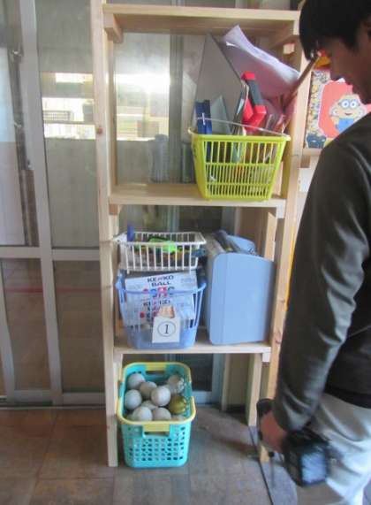 用務主事のK川さんが、器用さを活かし手作りで棚を作り、入り口付近の整理整頓を行ってくださいました。