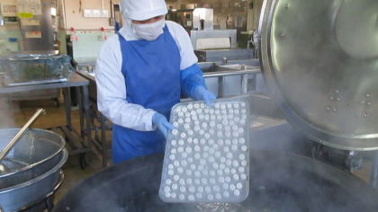 明日の11日は「鏡開き」です。給食でも1日早く、鏡開きにちなんだ「白玉あずき」を作りました。神様のお供えした鏡餅をいただくことで、1年間の無病息災を祈ります。詳しくは写真2枚目の食育メモをご覧ください。白玉あずきのあんこも、給食室の手作りです。作るには時間は少しかかりますが、意外と簡単です。あずきを2〜3度茹でこぼし、後は、豆がしっかりかぶるぐらいの多めの水と合わせてコトコト、煮ます。小豆がつぶれるぐらいに柔らかくなったら、お好みの砂糖の量で甘さをつければ完成です。手作りならではの優しい甘さに調整できるので、ぜひ作ってみてください。写真3枚目は、白玉を大きなお釜で茹でているところです。