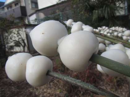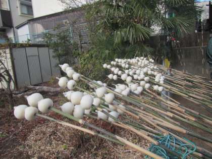 最後には、火を広げて、竹串につけた繭玉(まゆだま・お団子)をあぶって焼き団子を作りました。