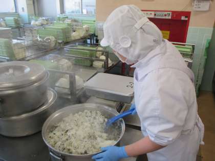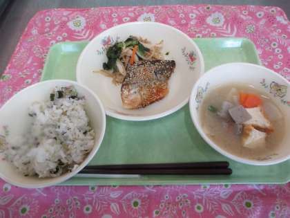 磯ごはんは、わかめとちりめんじゃこを酒、みりん、しょうゆで炒りつけてごはんと混ぜて作りました。わかめは、栄養的な分類では「赤」の仲間です。赤の仲間は、体を作ってくれるたんぱく質、カルシウムを多く含みます。わかめにはたんぱく質というより、カルシウムが多いです。ちりめんじゃこといっしょに、カルシウムをたくさん摂取できました!