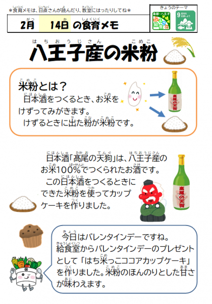 八王子は知る人ぞ知る、お米の一大産地です。そのお米を使って、日本酒も製造されているのですが、その製造過程では米粉や酒粕が出ます。今日は、その米粉を使って、ココアカップケーキを作りました。詳しくは食育メモをご覧ください。また、今日はバレンタインデーですね。バレンタインデーにチョコレートや物をプレゼントする習慣は、ヨーロッパから始まり、日本には1936年頃伝わったと言われています。現在も、友達や家族に感謝の気持ちを伝えるステキな日にもなっています。今日のカップケーキは給食室からチョコっとだけ、プレゼントです。いつも、給食をしっかり食べてくれてありがとうほざいます!!