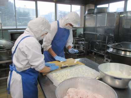 今日はひな祭り献立でした。ひな祭りは、子どもが健康に育つようにと願いを込めてひな人形を飾る習慣があります。その時には菱餅も飾りますが、給食でも菱餅に見立てた3色の白玉を作りました。白は清浄(きれいな様子)、ピンクは魔除け、緑は健康を意味するそうです。ピンクはいちご、緑は桑の葉の粉で色をつけました。椚田小の児童のみなさんが、これからも健康で元気に過ごせますように、給食も安全第一においしく作っていきたいと思います。