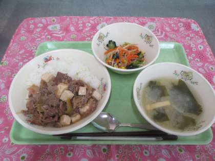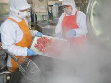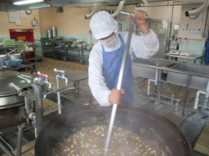すき焼き風煮物には国産の牛肉を使用しています。お肉屋さんが「椚田小の児童のみなさんにおいしい牛肉を食べてもらいたい!!」と「さし」がたっぷり入った、すばらしい牛肉を届けてくださいました。脂が多い肉はそのままでも、もちろんおいしいのですが、さっと湯引きしてたれに入れて煮ると、ぐっと味がよくなります。写真2枚目は牛肉を湯引きしているところです。ねぎ、しらたき、焼豆腐などといっしょにあまからいたれで煮て、とてもおいしく出来上がりました。
