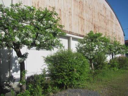 写真下:体育館の東側、プールと園芸用砂場との付近に植わっています。