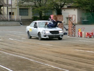 映画などでスタントマンをされているプロの方々が、自動車・自転車・歩行者の役に分かれて、体を張って交通事故を再現してくださいました。目の当たりにする事故現場に驚きの声を上げている生徒もいました。