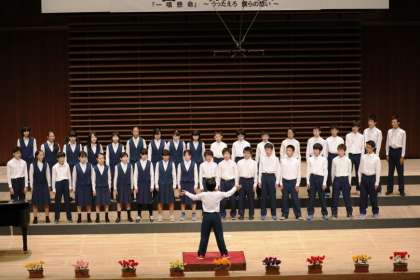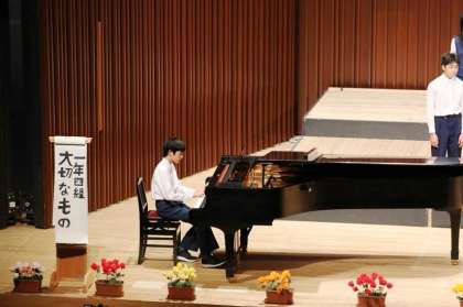 「私たち1年4組が歌う自由曲は『大切なもの』です。この曲は普段見失いがちなものを思い出せるような曲です。斉唱や合唱、かけ合いの部分があり、曲の最初のほうは声を小さくし、サビのところで声を大きくすることに気をつけて練習しました。各パートの声がきれいにそろうと一つのメロディが生まれます。1年4組はとても仲が良く元気なクラスです。クラスで協力し、一生懸命練習しました。4組らしく精一杯歌います。聞いてください。」(クラス紹介から)