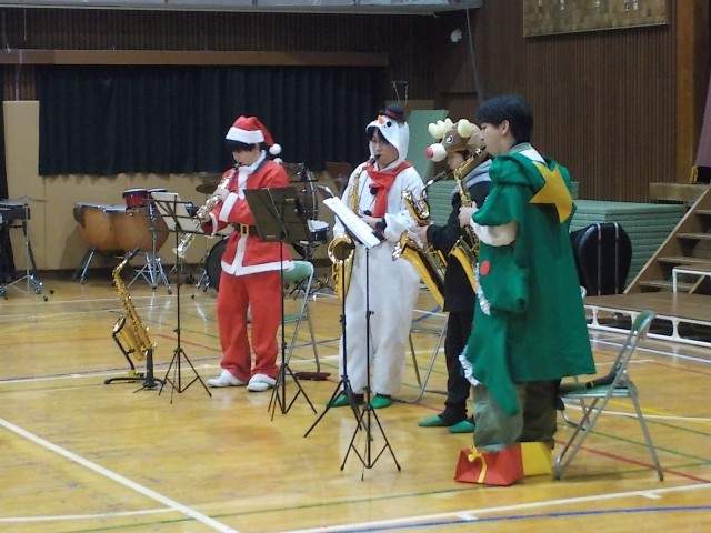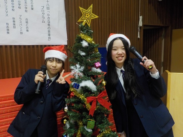 12月20日、青少対主催「小さな冬の音楽会」が実施されました。中野北小、清水小、甲ノ原中、有志団体(チームクリスマス)の4団体が参加し、本校生徒会司会のもとで開演されました。合唱や合奏・吹奏楽の演奏が催された会となりました。