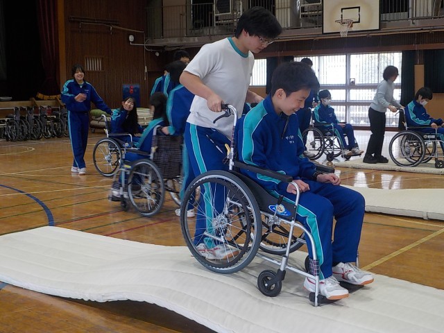 17日、福祉体験授業として、「車イス体験」を3年生が実施しました。体験することにより、相手を思いやりながら生活することの大切さを意識するよい機会となりました。