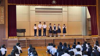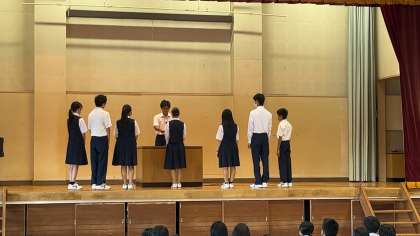 新旧生徒会役員入れ替わり 朝礼中です。
