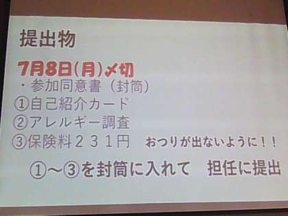 封筒に参加確認を記入し、自己紹介カード、アレルギー調査、保険料231円を入れて期日までに提出してください。