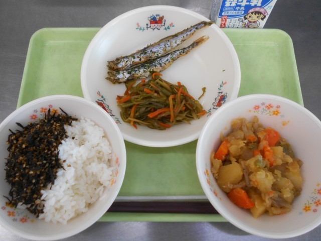 -献立-ごはんひじきのふりかけししゃもの磯辺焼き肉じゃが茎わかめのきんぴら牛乳今...