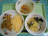 -献立-わかめごはん笹かまぼこのマヨネーズ焼きじゃがいものそぼろ煮キャベツのしょ...