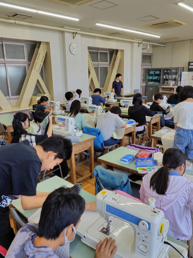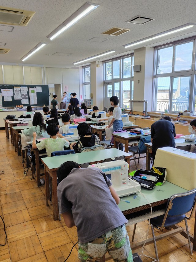 (チャコペンで印を付け、アイロンで布を折って、ミシンで縫っていきます。ミシンは5年生の時から使ってます)