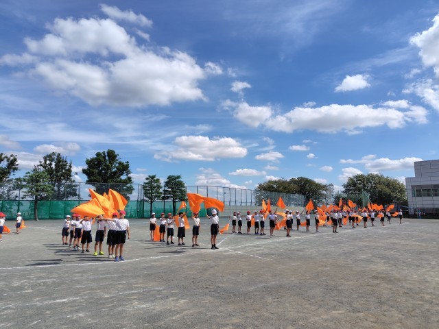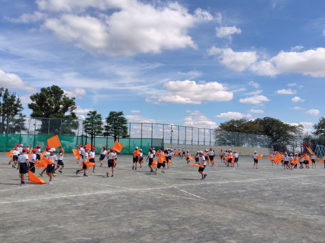 爽やかな秋晴れの校庭で運動会の練習です。ようやく暑さも峠を越え、穏やかな風もあり、絶好の練習コンディションです。