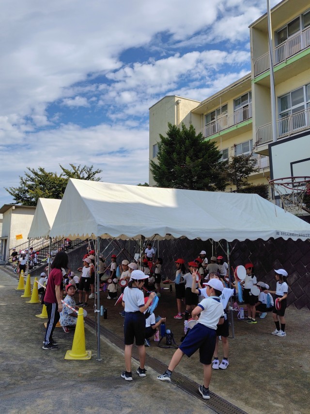 (休憩や水分補給をしっかり取ります。先生からのアドバイスも日陰で)
