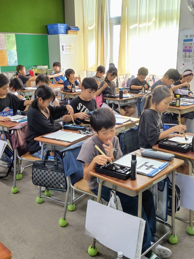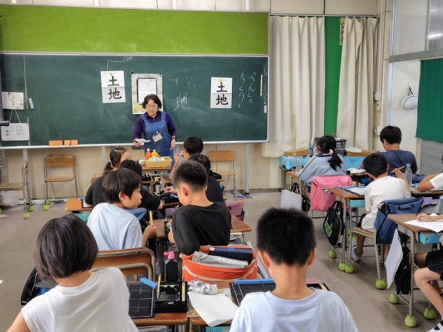 今日は「土地」と書きます。文字の「へん」や「つくり」の形に気をつけながら書きます。小さく、細くならないように堂々と書きましょうね。