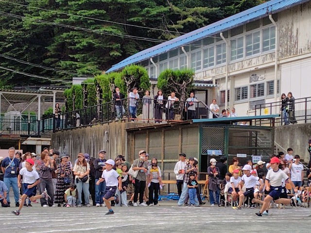 [3年生80m走] 今年から走る距離が伸びた3年生です。本部テントの優勝カップの前を駆け抜けます。