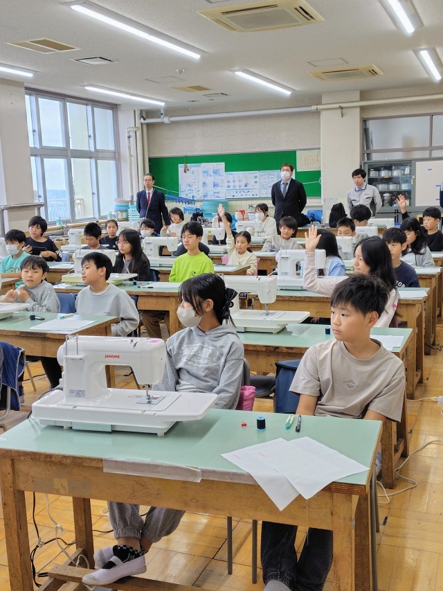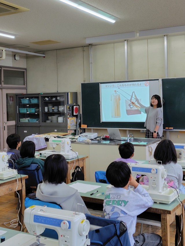 (「ミシンにトライ!手作りで楽しい生活」という学習単元です)