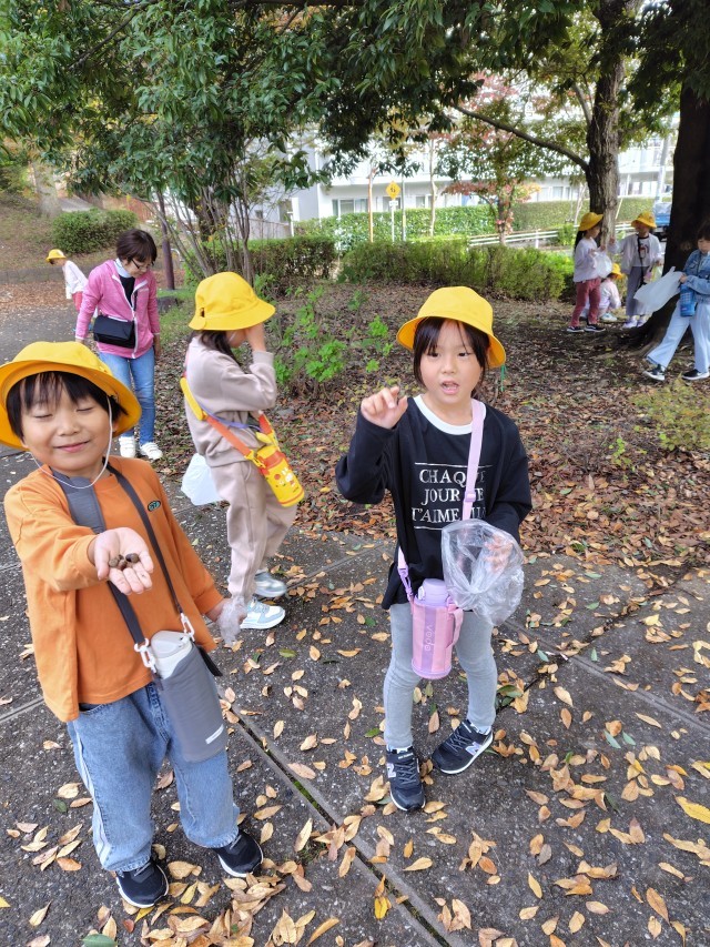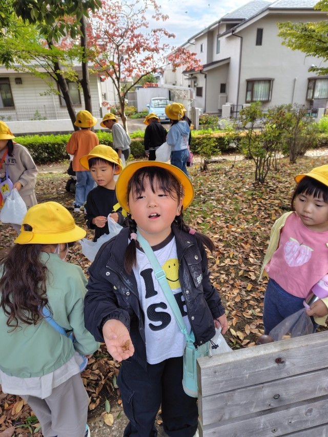 (落ち葉いっぱいの公園で、どんぐりをたくさんひろったよ!)