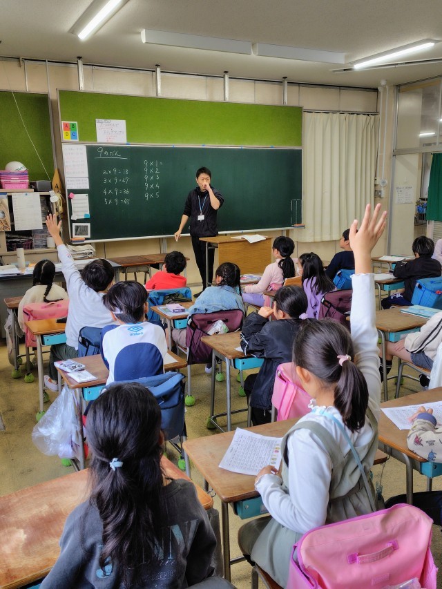 「かけ算」の学習もいよいよ9の段までやってきました。9の段の式と答えを順に確認しながら、気がついたことを発表しています。