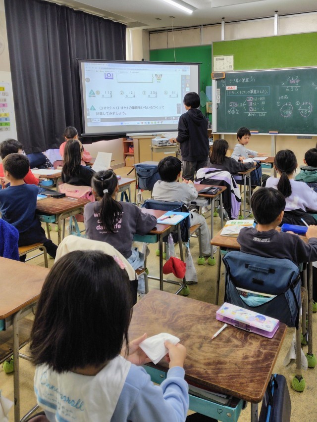 「1けたをかけるかけ算の筆算」を学習しています。「112×3」や「234×2」など、今日は3けた×1けたの筆算をします。
