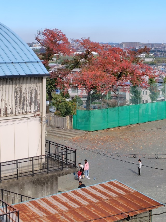(落ち葉が舞い散る中、3年生が理科の観察をしています。「かげと太陽」の学習かな)