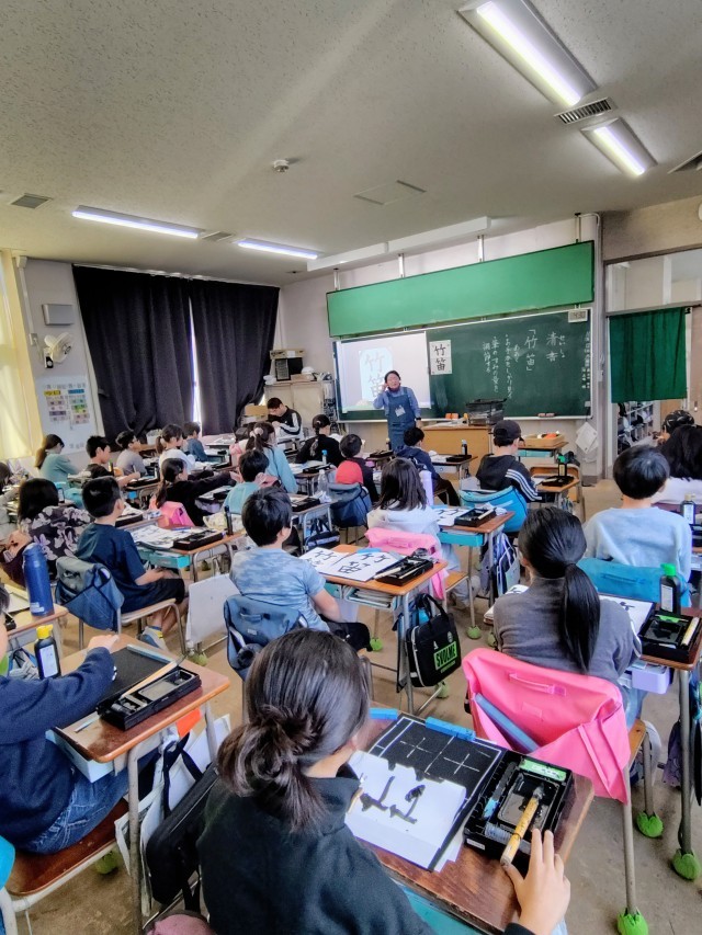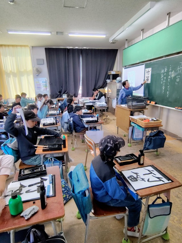 今日のお手本は「竹笛」です。「手本をよく見て書きましょうね」と先生からお話がありました。墨を付ける量にも気をつけましょう。