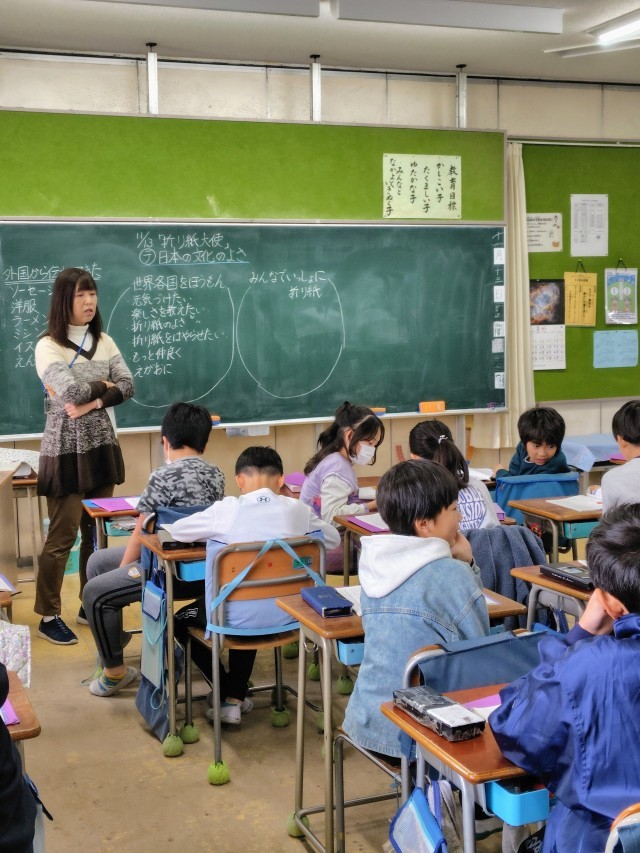 (敵対する民族同士の子どもたちが、仲良く一緒に折り紙を教え合っています。その姿を見る加瀬さんの気持ちを考えています)