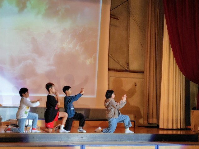 (4年生らしく、元気よくテンポの良い舞台です。演技だけでなく、自分たちで照明や音響もがんばっています)