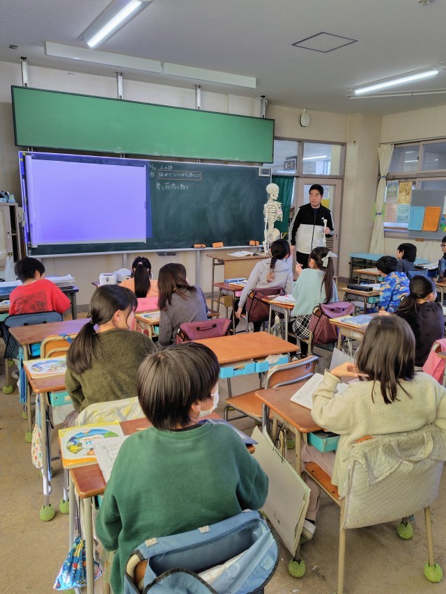 (ヒトの体はどうやって動いているのかな。骨の人体模型と一緒に学習します)