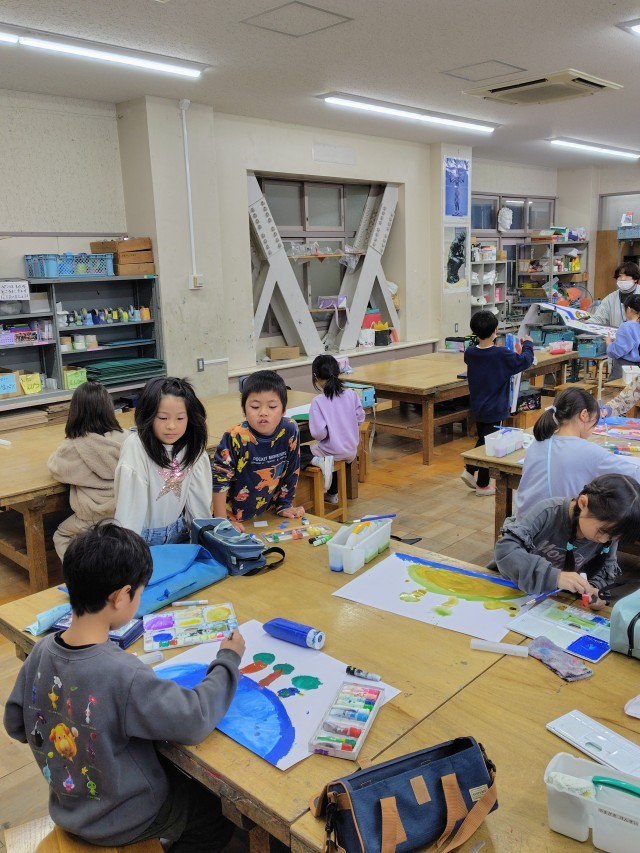 先週末の文化祭が終わり、昨日から学校は普段の静かな授業風景に戻っています。図工室では、2年生が絵の具で絵を描いています。
