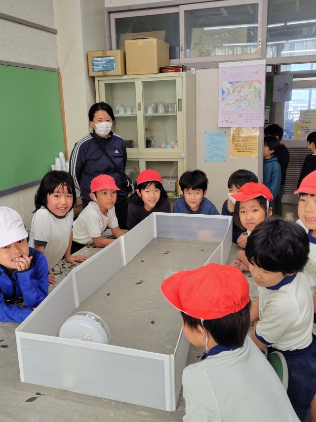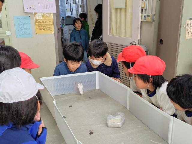 このところ毎日の休み時間、ハムスター「おもちくん」の見学会がクラスごとに開かれています。今日は2年生の順番です。みんな「かわいいー!」と言いながら見ています。