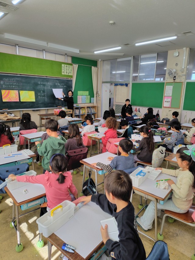 「いろとりどりの、とり」を描いています。鳥さん本体とともに背景の絵も描いていきます。今日は背景づくりのようです。先生がとても大きな画用紙を配っています。